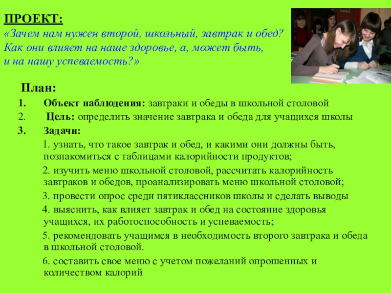 4. выяснить, как влияет завтрак и обед на состояние здоровья учащихся, их работоспособность и успеваемость;