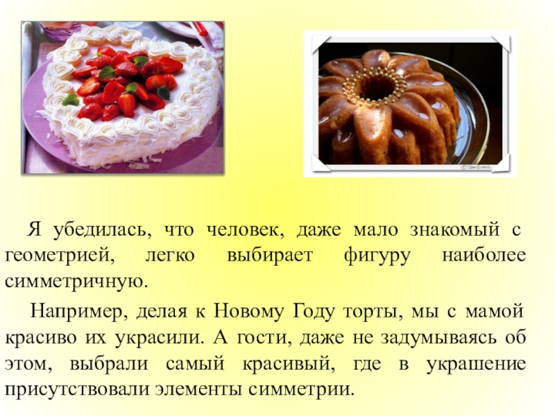 Например, делая к Новому Году торты, мы с мамой красиво их украсили. А гости, даже не задумываясь об этом, выбрали самый красивый, где в украшение присутствовали элементы симметрии.