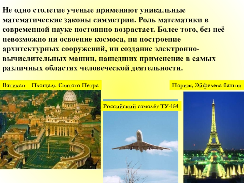 Слайд 8Не одно столетие ученые применяют уникальные математические законы симметрии. Роль математики