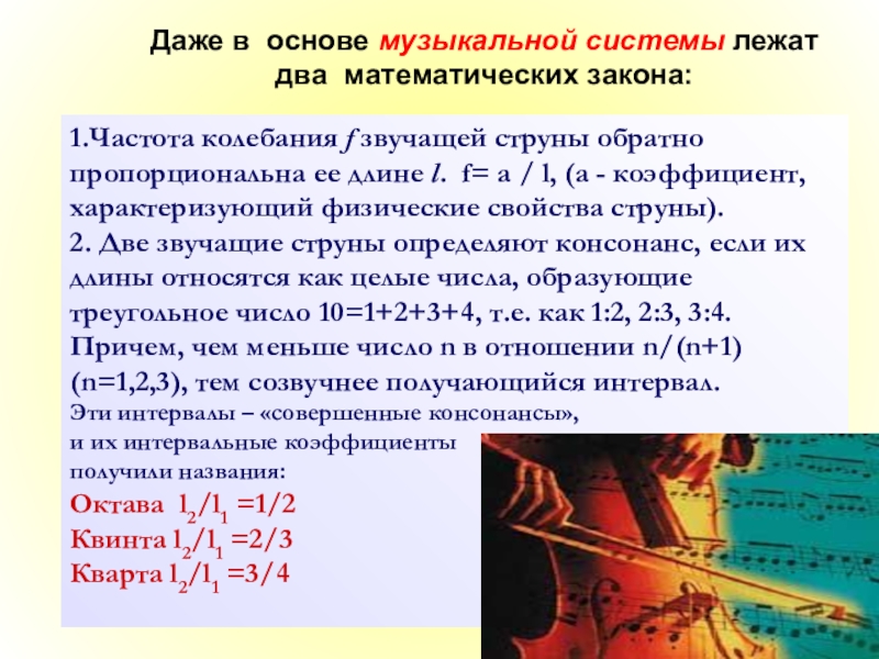 2. Две звучащие струны определяют консонанс, если их длины относятся как целые числа, образующие треугольное число 10=1+2+3+4, т.е. как 1:2, 2:3, 3:4. Причем, чем меньше число n в отношении n/(n+1) (n=1,2,3), тем созвучнее получающийся интервал.
