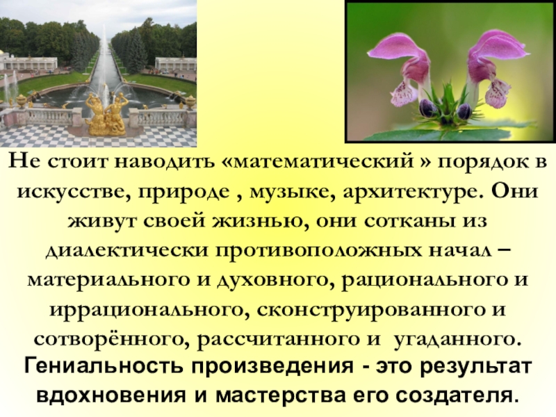 Слайд 17Не стоит наводить «математический » порядок в искусстве, природе , музыке,