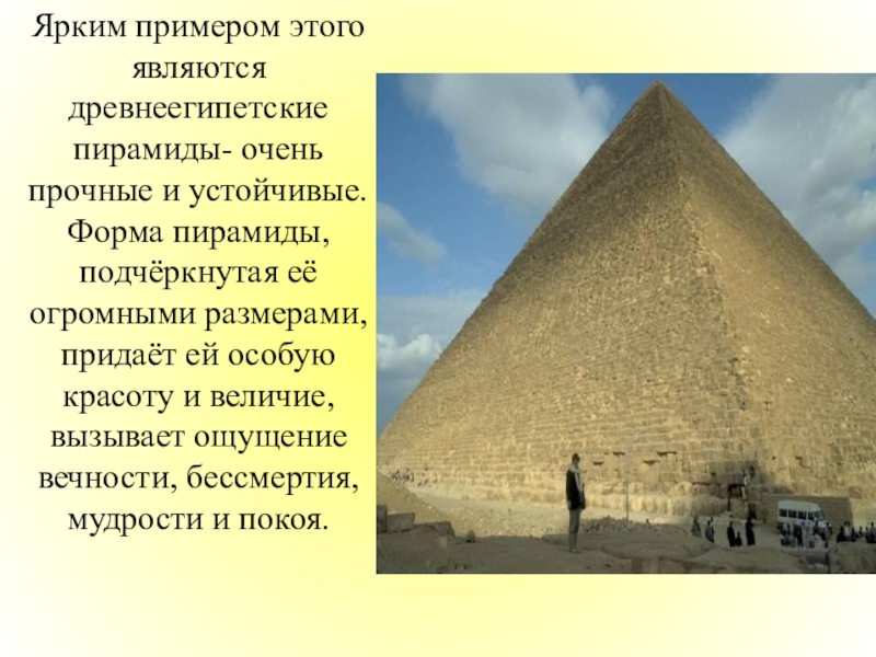 пирамиды, подчёркнутая её огромными размерами, придаёт ей особую красоту и величие, вызывает ощущение вечности, бессмертия, мудрости и покоя.