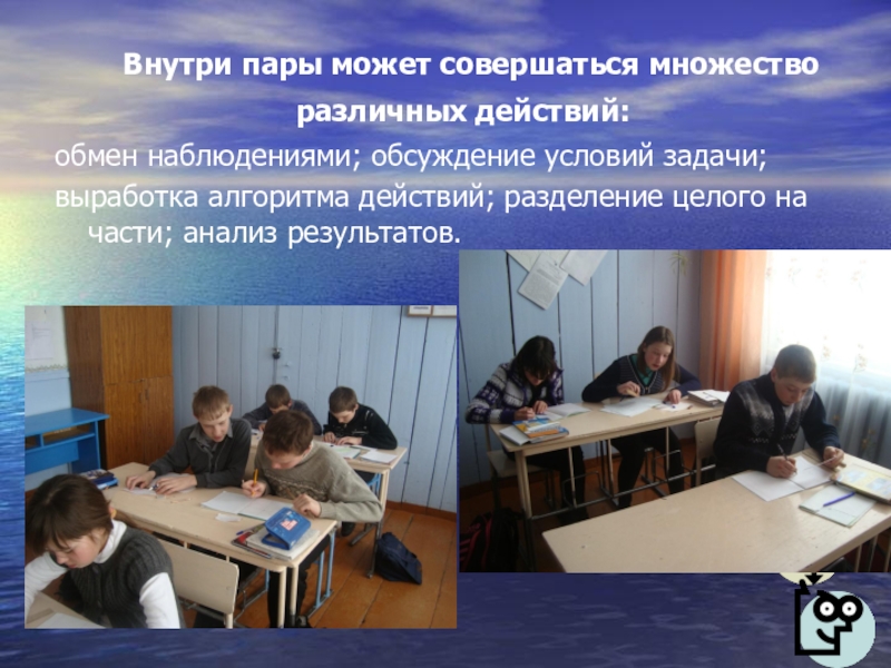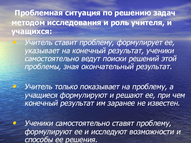 Учитель только показывает на проблему, а учащиеся формулируют и решают ее, при чем конечный результат им заранее не известен.