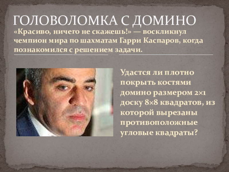 «Красиво, ничего не скажешь!» — воскликнул чемпион мира по шахматам Гарри Каспаров, когда познакомился с решением задачи.