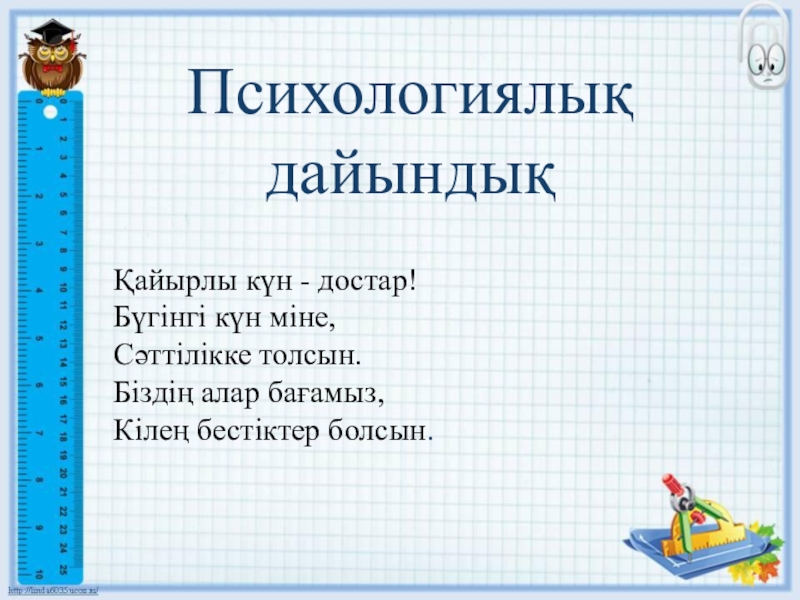 Психологиялық дайындықҚайырлы күн - достар!Бүгінгі күн міне,Сәттілікке толсын.Біздің алар бағамыз,Кілең бестіктер болсын.