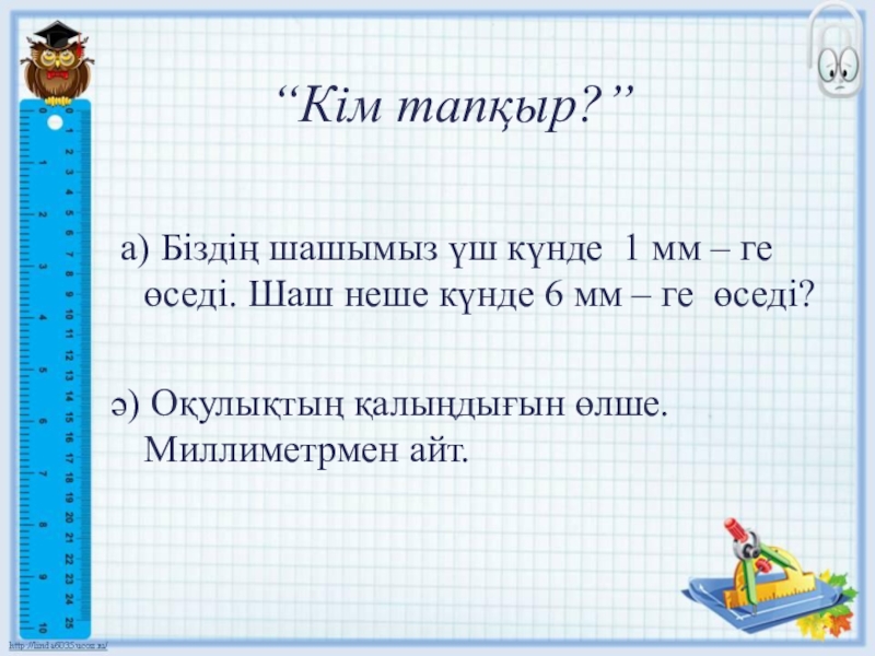 “Кім тапқыр?” а) Біздің шашымыз үш күнде 1 мм – ге өседі. Шаш неше күнде 6 мм