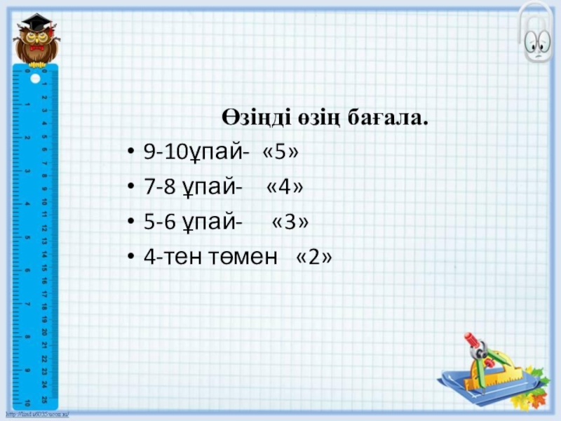 Өзіңді өзің бағала.9-10ұпай- «5» 7-8 ұпай-  «4»5-6 ұпай-   «3»4-тен төмен  «2»
