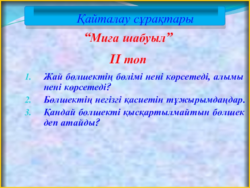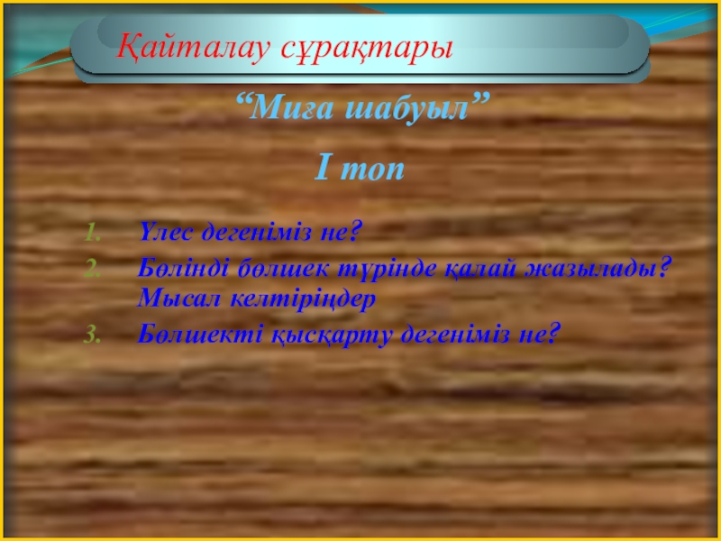 Қайталау сұрақтарыҮлес дегеніміз не?Бөлінді бөлшек түрінде қалай жазылады? Мысал келтіріңдерБөлшекті қысқарту дегеніміз не?“Миға шабуыл” I топ