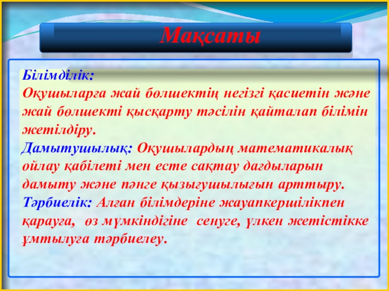 Білімділік: Оқушыларға жай бөлшектің негізгі қасиетін және жай бөлшекті қысқарту тәсілін қайталап білімін жетілдіру.Дамытушылық: Оқушылардың математикалық ойлау қабілеті мен есте сақтау дағдыларын дамыту және пәнге қызығушылығын арттыру.Тәрбиелік: Алған білімдеріне жауапкершілікпен қарауға, өз мүмкіндігіне сенуге, үлкен