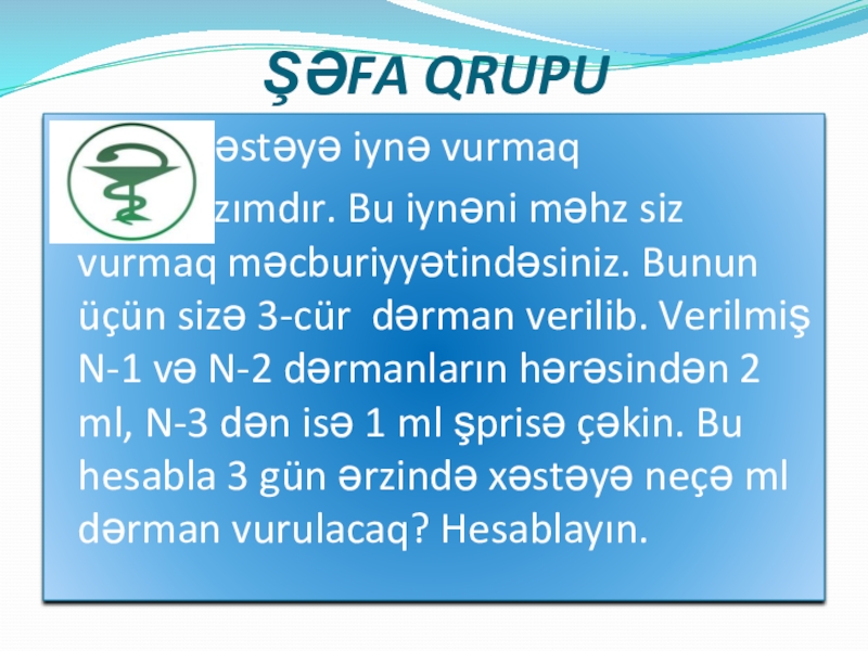 ŞƏFA QRUPU			 Xəstəyə iynə vurmaq 			lazımdır. Bu iynəni məhz siz vurmaq məcburiyyətindəsiniz. Bunun üçün sizə 3-cür dərman