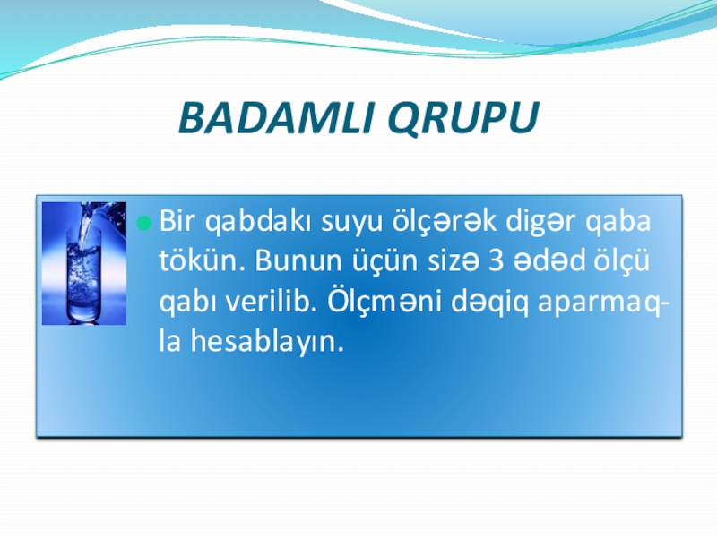 BADAMLI QRUPUBir qabdakı suyu ölçərək digər qaba tökün. Bunun üçün sizə 3 ədəd ölçü qabı verilib. Ölçməni