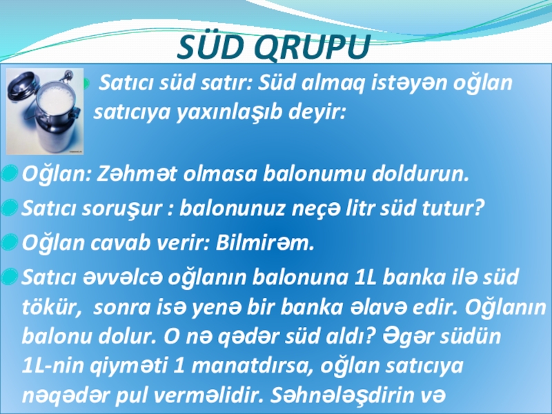 SÜD QRUPU Satıcı süd satır: Süd almaq istəyən oğlan  satıcıya yaxınlaşıb deyir: Oğlan: Zəhmət olmasa balonumu