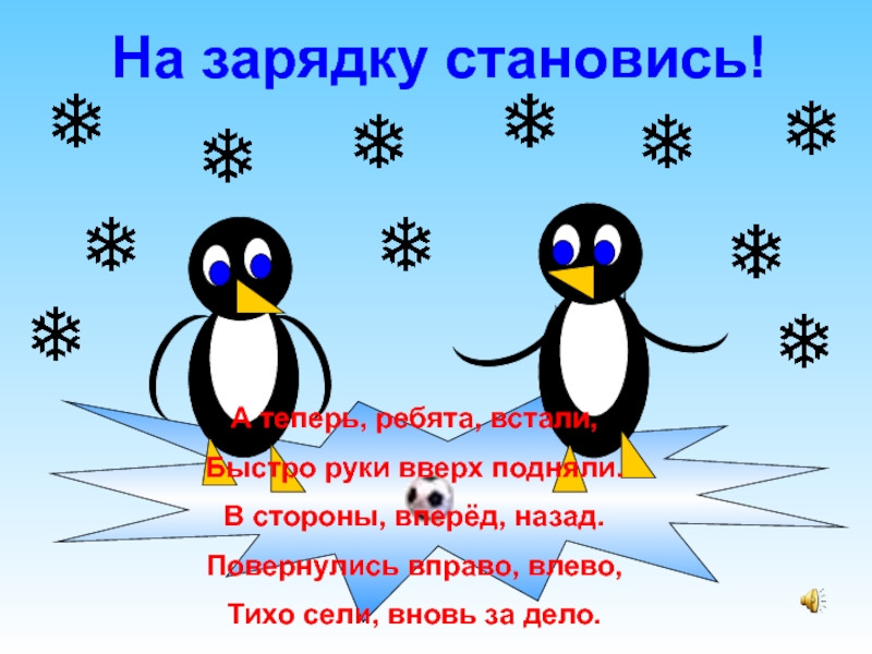 На зарядку становись!А теперь, ребята, встали,Быстро руки вверх подняли.В стороны, вперёд, назад.Повернулись вправо, влево,Тихо сели, вновь за