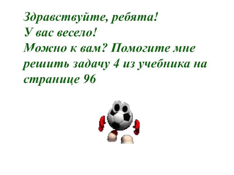 Слайд 7Здравствуйте, ребята! У вас весело! Можно к вам? Помогите мне решить задачу 4