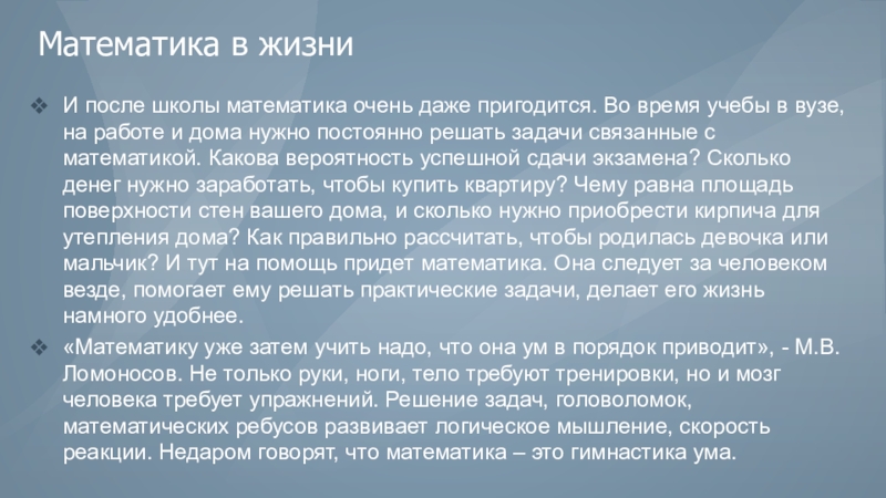 учебы в вузе, на работе и дома нужно постоянно решать задачи связанные с математикой. Какова вероятность успешной сдачи экзамена? Сколько денег нужно заработать, чтобы купить квартиру? Чему равна площадь поверхности стен вашего дома, и сколько нужно приобрести кирпича для утепления дома? Как правильно рассчитать, чтобы родилась девочка или мальчик? И тут на помощь придет математика. Она следует за человеком везде, помогает ему решать практические задачи, делает его жизнь намного удобнее.