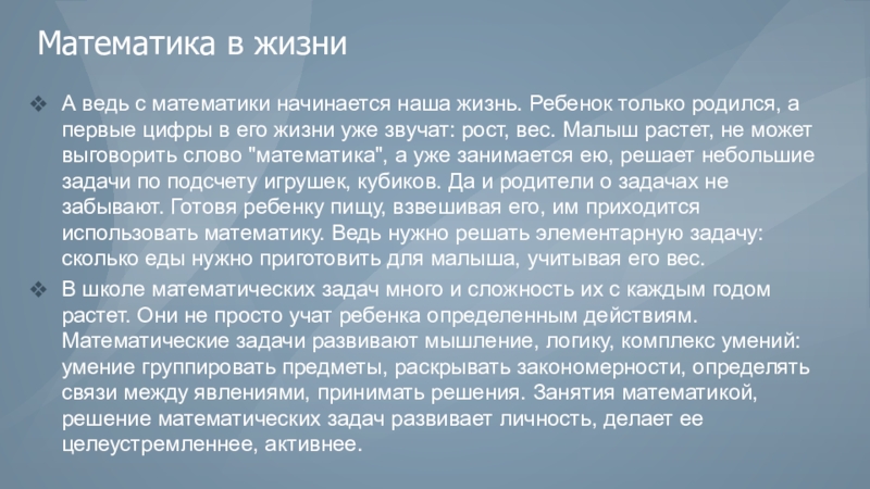 родился, а первые цифры в его жизни уже звучат: рост, вес. Малыш растет, не может выговорить слово "математика", а уже занимается ею, решает небольшие задачи по подсчету игрушек, кубиков. Да и родители о задачах не забывают. Готовя ребенку пищу, взвешивая его, им приходится использовать математику. Ведь нужно решать элементарную задачу: сколько еды нужно приготовить для малыша, учитывая его вес.