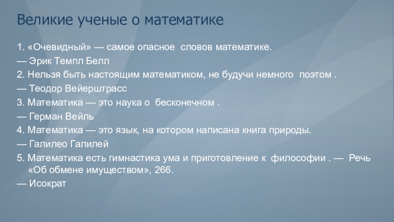 5. Математика есть гимнастика ума и приготовление к философии . — Речь «Об обмене имуществом», 266.