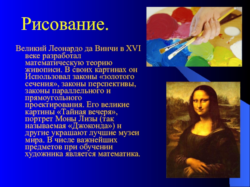 В своих картинах он Использовал законы «золотого сечения», законы перспективы, законы параллельного и прямоугольного проектирования. Его великие картины «Тайная вечеря», портрет Моны Лизы (так называемая «Джоконда») н другие украшают лучшие музеи мира. B числе важнейших предметов при обучении художника является математика.