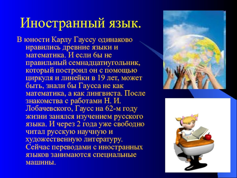 И если 6ы не правильный семнадцатиугольник, который построил он c помощью циркуля и линейки в 19 лет, может быть, знали бы Гaycca не как математика, a как лингвиста. После знакомства c работами H. И. Лобачевскогo, Гаусс на 62-м году жизни занялся изучением русского языка. И через 2 года уже свободно читал русскую научную и художественную литературу. Сейчас переводами c иностранных языков занимаются специальные машины.