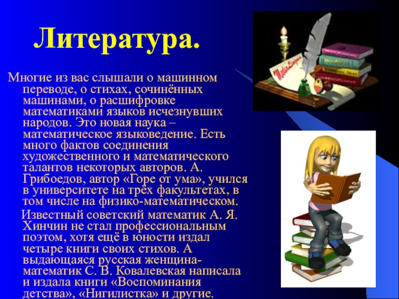 o расшифровке математиками языков исчезнувших народов. Это новая наука – математическое языковедение. Есть много фактов соединения художественного и математического талантов некоторых авторов. A. Грибоедов, автор «Горе от ума», учился в университете на трёх факультетах, в том числе на физико-математическом.
