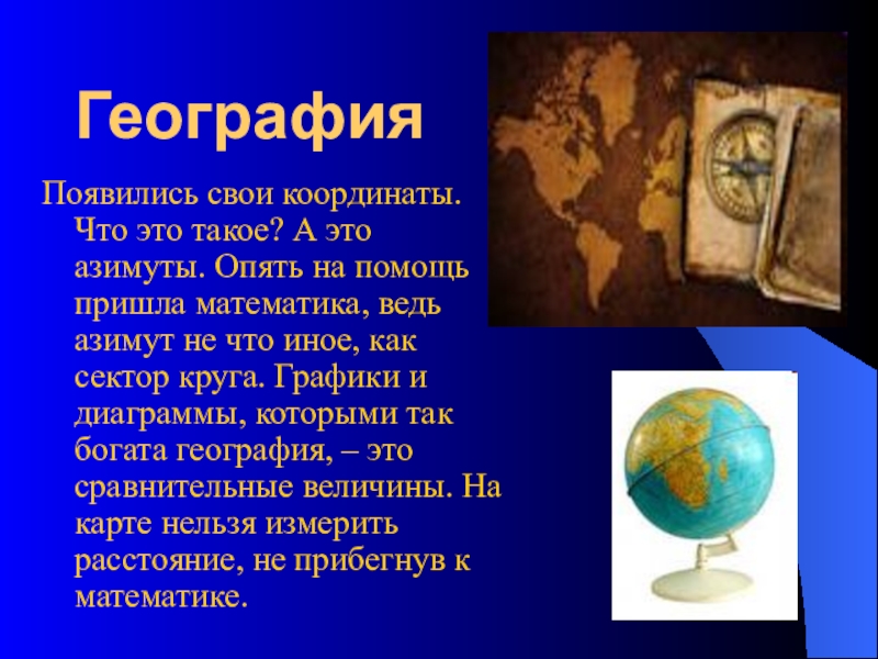 помощь пришла математика, ведь азимут не что иное, как сектор круга. Графики и диаграммы, которыми так богата география, – это сравнительные величины. На карте нельзя измерить расстояние, не прибегнув к математике.