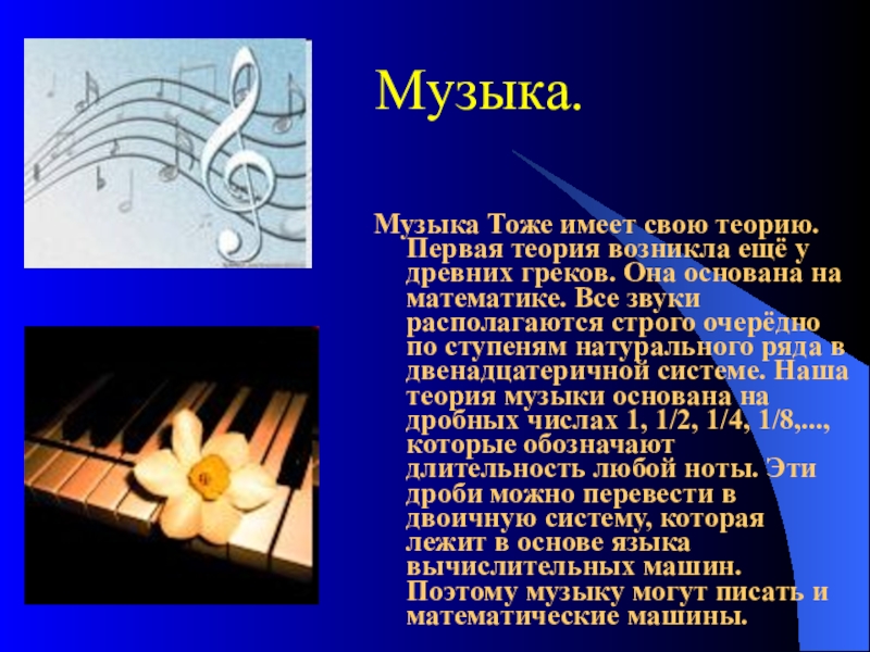 греков. Она основана на математике. Все звуки располагаются строго очерёдно по ступеням натурального ряда в двенадцатеричной системе. Наша теория музыки основана на дробных числах 1, 1/2, 1/4, 1/8,..., которые обозначают длительность любой ноты. Эти дроби можно перевести в двоичную систему, которая лежит в основе языка вычислительных машин. Поэтому музыку могут писать и математические машины.