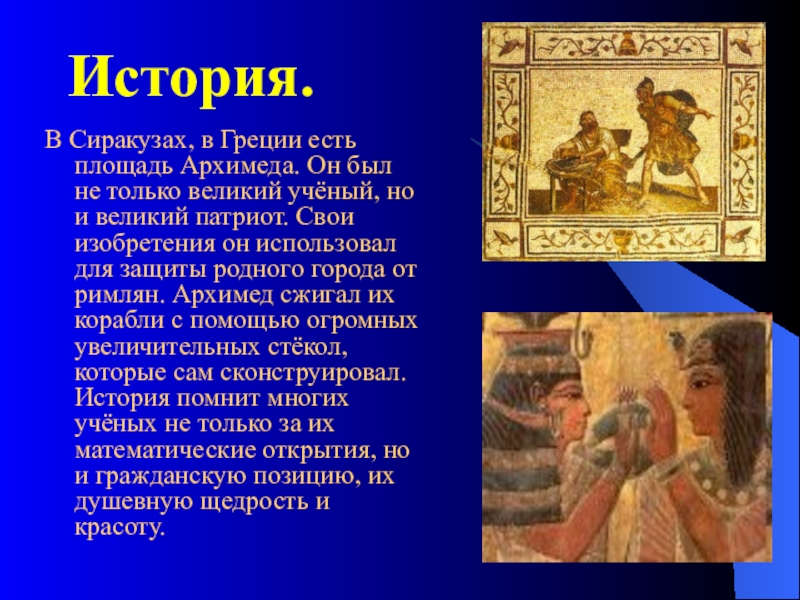 только великий учёный, но и великий патриот. Свои изобретения он использовал для защиты родного города от римлян. Архимед сжигал их корабли c помощью огромных увеличительных стёкол, которые сам сконструировал. История помнит многих учёных не только за их математические открытия, но и гражданскую позицию, их душевную щедрость и красоту.