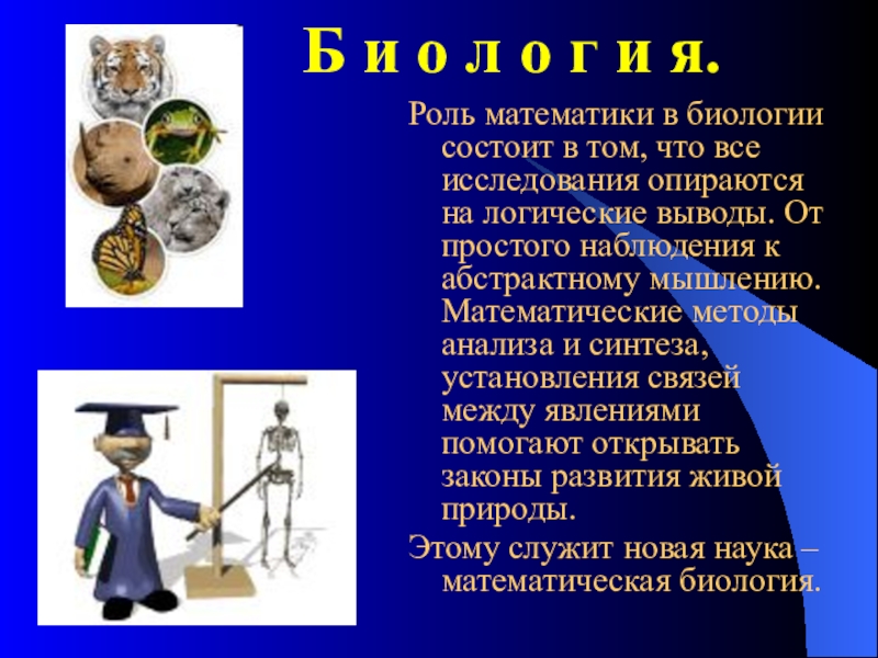 биологии состоит в том, что все исследования опираются на логические выводы. От простого наблюдения к абстрактному мышлению. Математические методы анализа и синтеза, установления связей между явлениями помогают открывать законы развития живой природы.