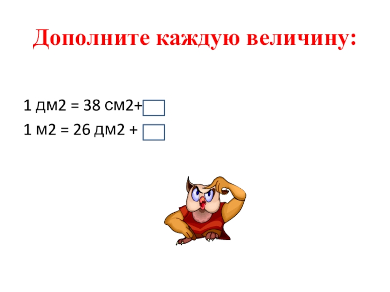 Дополните каждую величину:1 дм2 = 38 см2+1 м2 = 26 дм2 +
