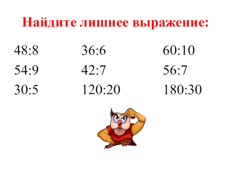 Найдите лишнее выражение:48:8      36:6        60:1054:9