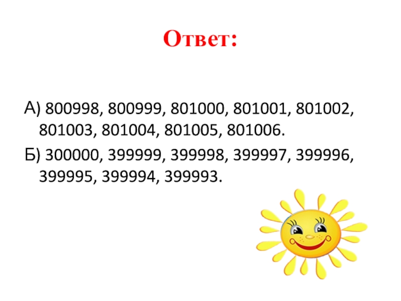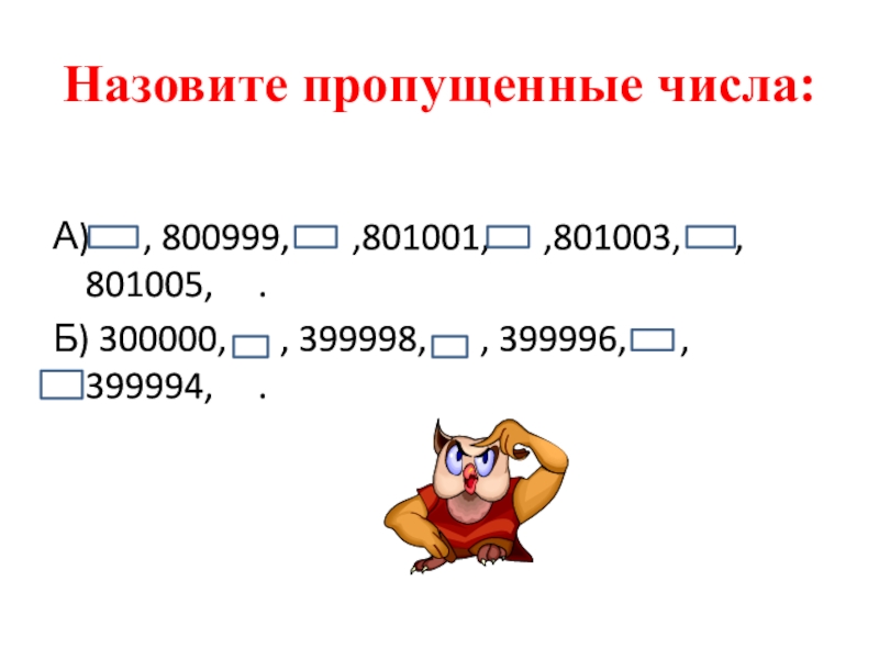 Назовите пропущенные числа:А)   , 800999,    ,801001,   ,801003,   ,