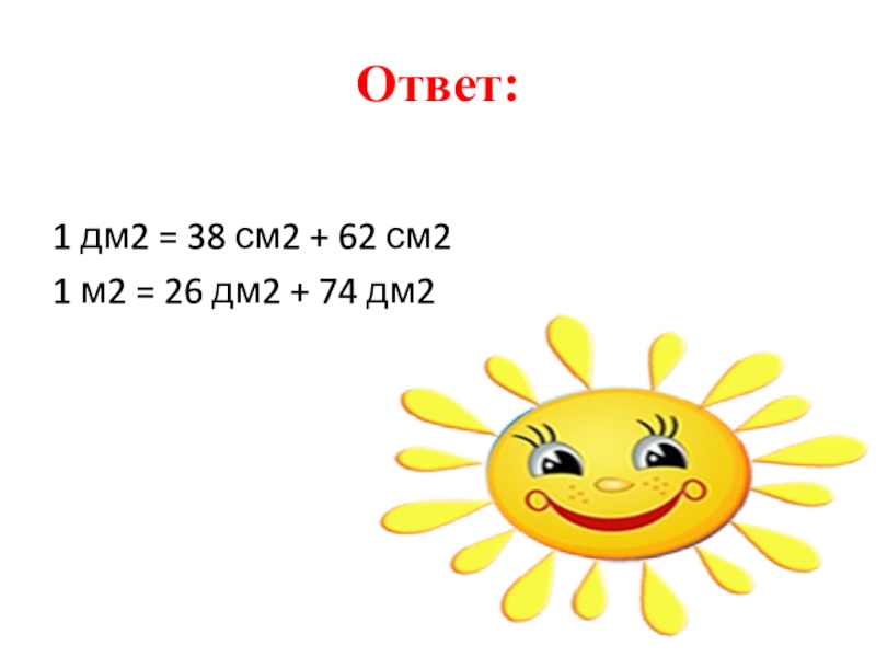 Ответ:1 дм2 = 38 см2 + 62 см21 м2 = 26 дм2 + 74 дм2