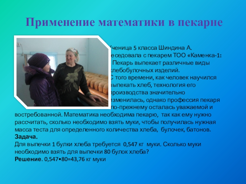 по-прежнему осталась уважаемой и востребованной. Математика необходима пекарю, так как ему нужно рассчитать, сколько необходимо взять муки, чтобы получилась нужная масса теста для определенного количества хлеба, булочек, батонов.