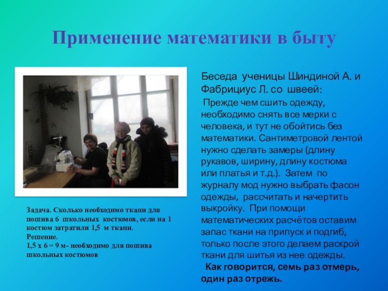 Прежде чем сшить одежду, необходимо снять все мерки с человека, и тут не обойтись без математики. Сантиметровой лентой нужно сделать замеры (длину рукавов, ширину, длину костюма или платья и т.д.). Затем по журналу мод нужно выбрать фасон одежды, рассчитать и начертить выкройку. При помощи математических расчётов оставим запас ткани на припуск и подгиб, только после этого делаем раскрой ткани для шитья из нее одежды.