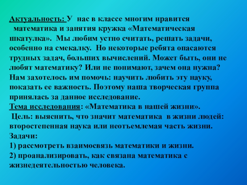 «Математическая шкатулка». Мы любим устно считать, решать задачи, особенно на смекалку. Но некоторые ребята опасаются трудных задач, больших вычислений. Может быть, они не любят математику? Или не понимают, зачем она нужна? Нам захотелось им помочь: научить любить эту науку, показать ее важность. Поэтому наша творческая группа принялась за данное исследование.