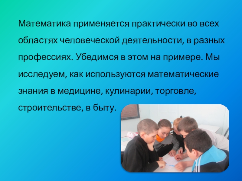 Убедимся в этом на примере. Мы исследуем, как используются математические знания в медицине, кулинарии, торговле, строительстве, в быту.