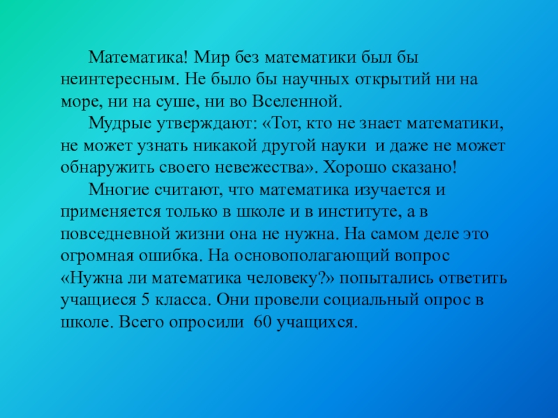«Нужна ли математика человеку?» попытались ответить учащиеся 5 класса. Они провели социальный опрос в школе. Всего опросили 60 учащихся.