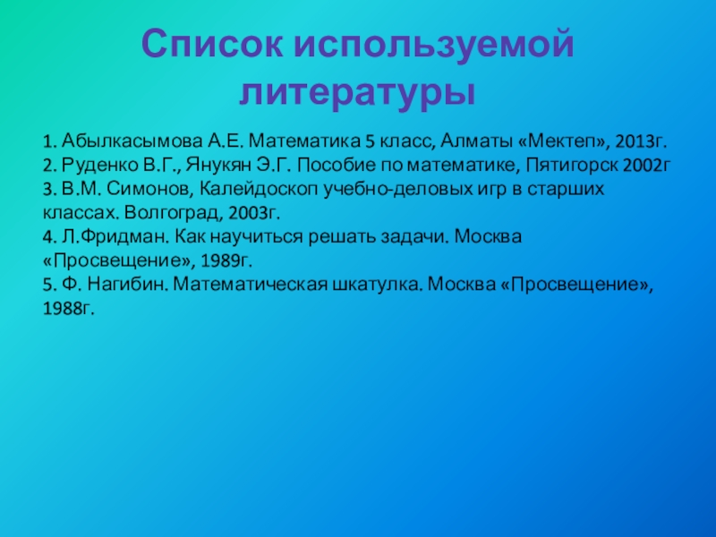 1. Абылкасымова А.Е. Математика 5 класс, Алматы «Мектеп», 2013г.