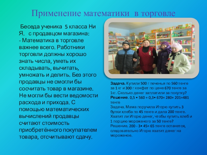 - Математика в торговле важнее всего. Работники торговли должны хорошо знать числа, уметь их складывать, вычитать, умножать и делить. Без этого продавцы не смогли бы сосчитать товар в магазине. Не могли бы вести ведомости расхода и прихода. С помощью математических вычислений продавцы считают стоимость приобретённого покупателем товара, отсчитывают сдачу.