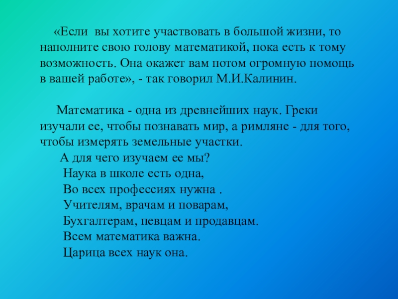 голову математикой, пока есть к тому возможность. Она окажет вам потом огромную помощь в вашей работе», - так говорил М.И.Калинин.