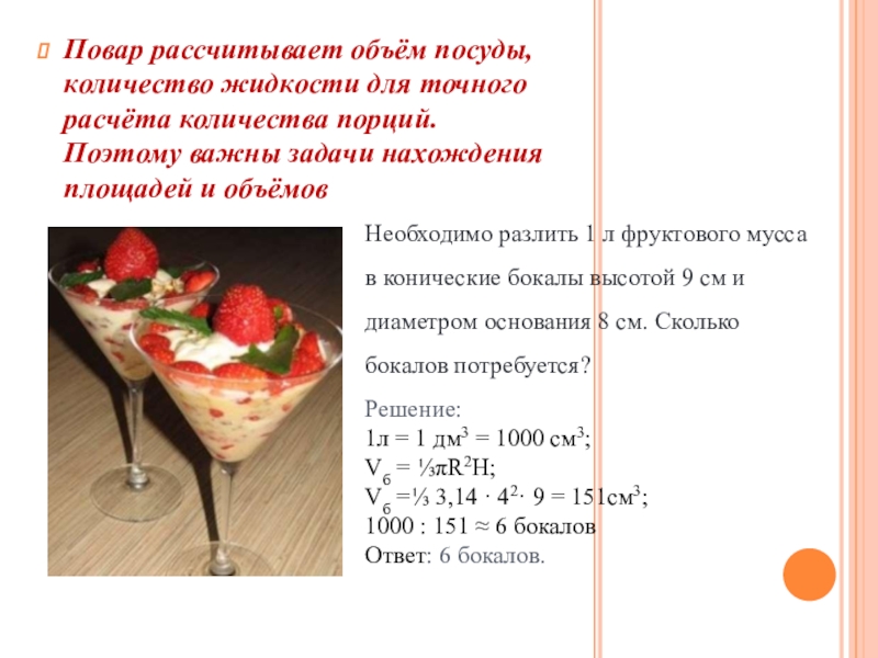 Необходимо разлить 1 л фруктового мусса в конические бокалы высотой 9 см и диаметром основания 8 см. Сколько бокалов потребуется?