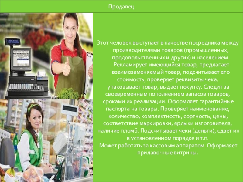 Может работать за кассовым аппаратом. Оформляет прилавочные витрины.