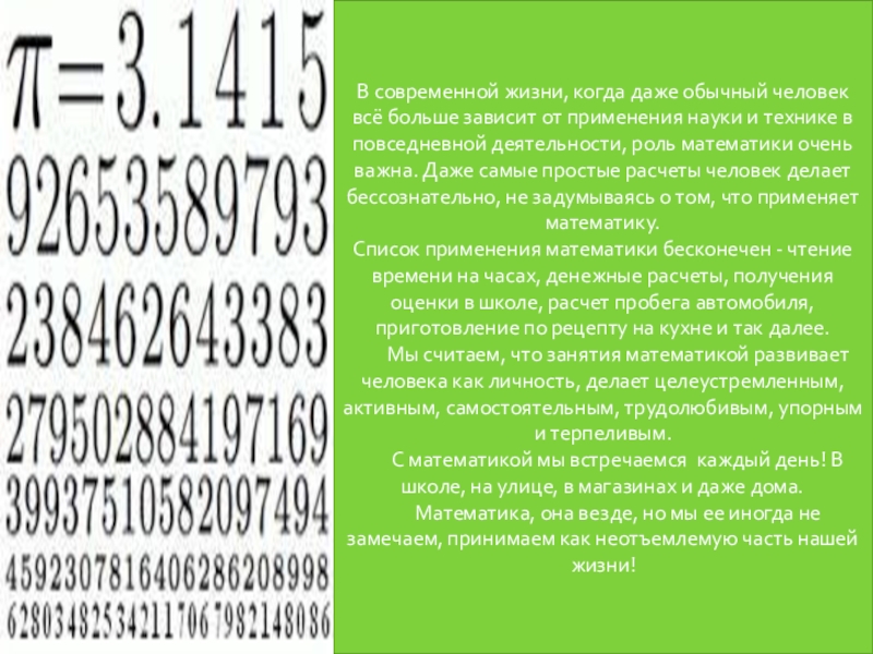 сможет решать, мерить и считать. Без математики невозможно построить дом, сосчитать деньги в кармане, измерить расстояние.
