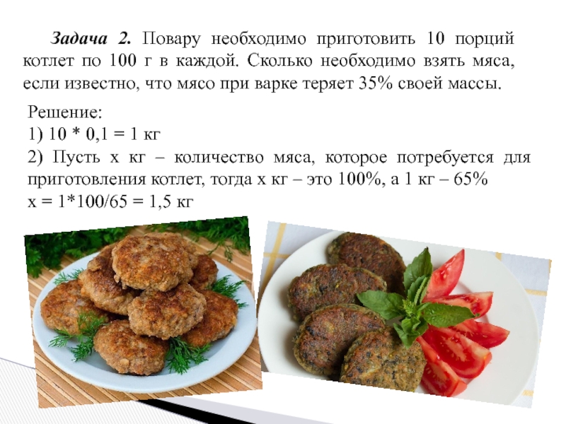 2) Пусть х кг – количество мяса, которое потребуется для приготовления котлет, тогда х кг – это 100%, а 1 кг – 65%