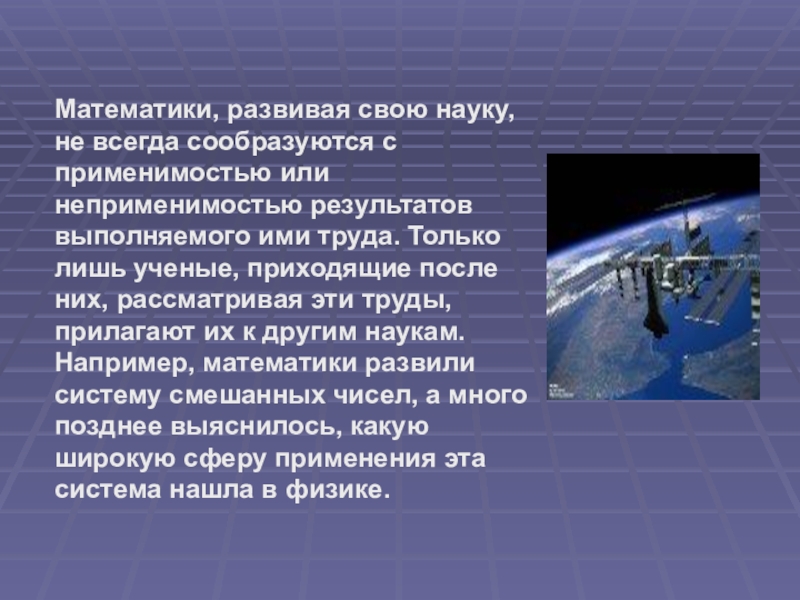 Слайд 10Математики, развивая свою науку, не всегда сообразуются с применимостью или неприменимостью