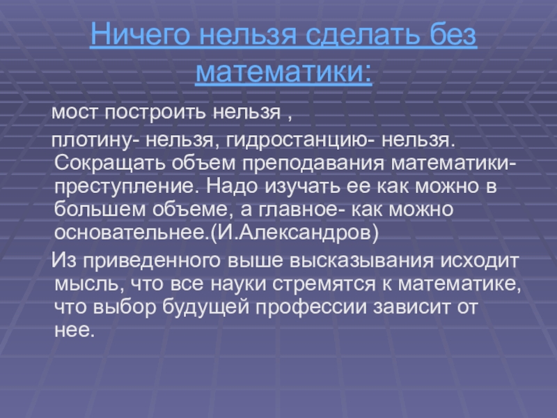 плотину- нельзя, гидростанцию- нельзя. Сокращать объем преподавания математики- преступление. Надо изучать ее как можно в большем объеме, а главное- как можно основательнее.(И.Александров)