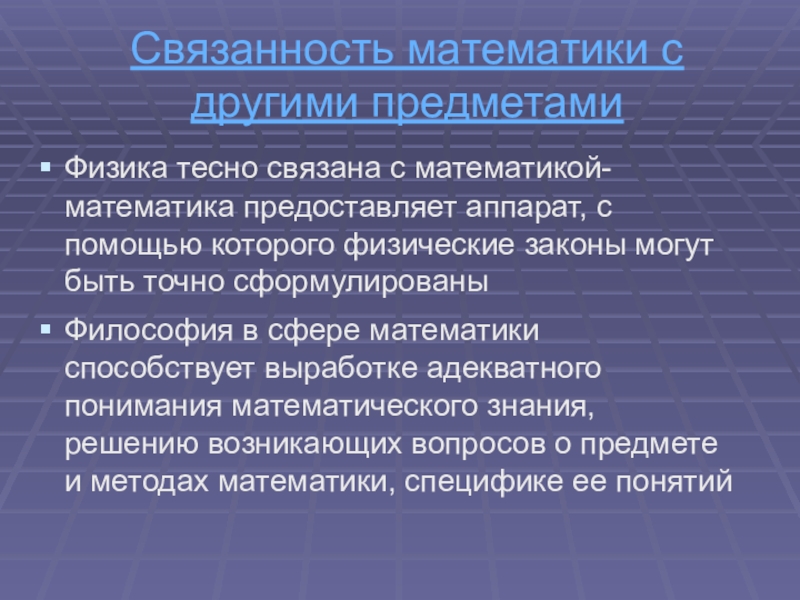 Философия в сфере математики способствует выработке адекватного понимания математического знания, решению возникающих вопросов о предмете и методах математики, специфике ее понятий