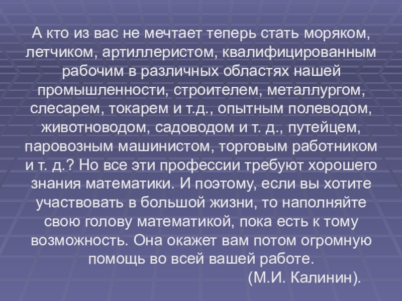 квалифицированным рабочим в различных областях нашей промышленности, строителем, металлургом, слесарем, токарем и т.д., опытным полеводом, животноводом, садоводом и т. д., путейцем, паровозным машинистом, торговым работником и т. д.? Но все эти профессии требуют хорошего знания математики. И поэтому, если вы хотите участвовать в большой жизни, то наполняйте свою голову математикой, пока есть к тому возможность. Она окажет вам потом огромную помощь во всей вашей работе.