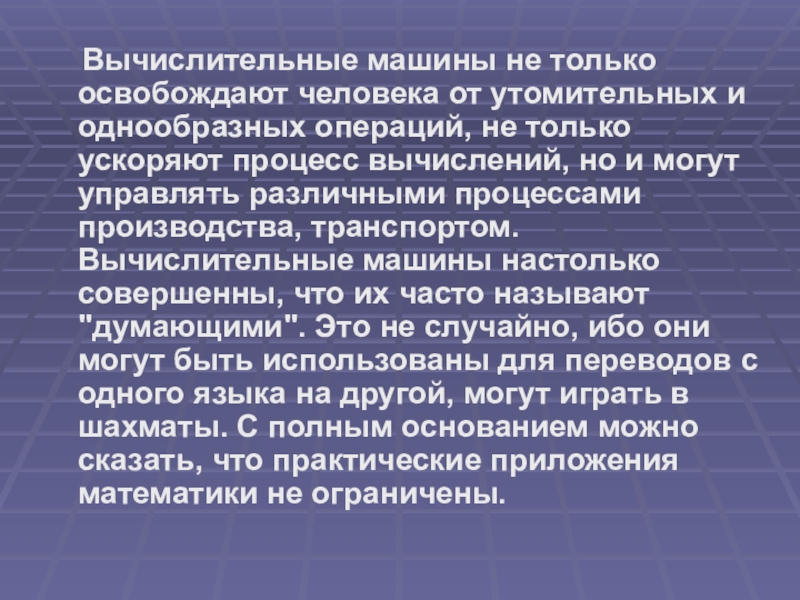 однообразных операций, не только ускоряют процесс вычислений, но и могут управлять различными процессами производства, транспортом. Вычислительные машины настолько совершенны, что их часто называют "думающими". Это не случайно, ибо они могут быть использованы для переводов с одного языка на другой, могут играть в шахматы. С полным основанием можно сказать, что практические приложения математики не ограничены.