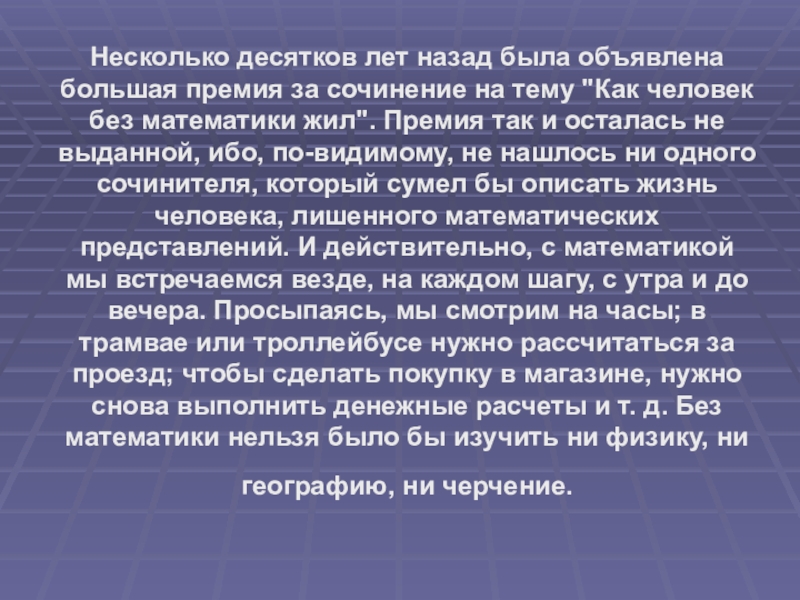 тему "Как человек без математики жил". Премия так и осталась не выданной, ибо, по-видимому, не нашлось ни одного сочинителя, который сумел бы описать жизнь человека, лишенного математических представлений. И действительно, с математикой мы встречаемся везде, на каждом шагу, с утра и до вечера. Просыпаясь, мы смотрим на часы; в трамвае или троллейбусе нужно рассчитаться за проезд; чтобы сделать покупку в магазине, нужно снова выполнить денежные расчеты и т. д. Без математики нельзя было бы изучить ни физику, ни географию, ни черчение.